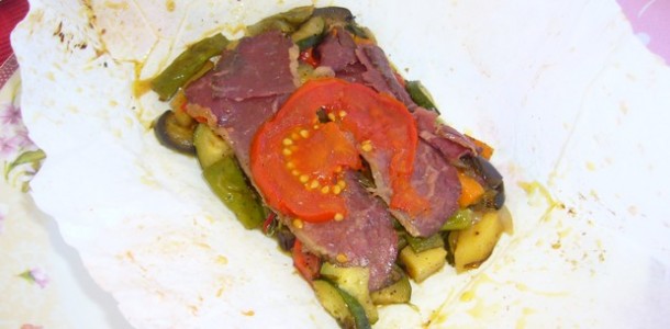Öldürülen sebzeler büyük bir kaba çıkarılır, ince kıyılmış tarhun, tuz ve karabiberle tatlandırılıp, iyice harmanlanır. 6 Adet 30*30 yağlı fırın kâğıdı hazırlanır,sebzeler kağıtlara paylaştırılır;üzerlerine ikişer dilim pastırma ve bir yuvarlak dilim domates yerleştirilip kağıtlar paket gibi kapatılır.30*30 alüminyum folyoya da sarılıp önceden ısıtılmış 200 derece fırında 20 dakika fırınlanır. Servise hazırdır. Afiyet olsun.