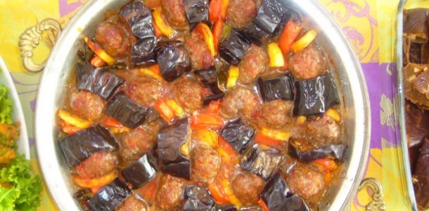 Kıyma, kuru soğan, kırmızıbiber, tuz ve maydanoz karıştırılıp yoğrularak harç yapılır.-Harçtan küçük parçalar alınarak şekil verilir.-Patlıcan halka şeklinde doğranıp yağda hafif kızartılır.-Doğranmış olan yeşilbiber, domates, patlıcan ve köfteler sıra ile tepsiye dizilir.-Ilık suda yapılan salça üzerine dökülerek fırına atılır.-10 dakika fırında pişirilir ve sıcak servis yapılır.