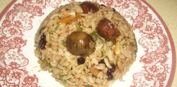 Pirinç sıcak suda 2 saat bekletilir, bol su ile durulanır, süzmeye bırakılır. Soğan yemeklik doğranır, mantarlar ince doğranır, kestaneler haşlanıp soyulur dörde bölünür.