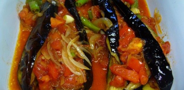 Patlıcanlar alaca soyulur, dikine olarak sapından ayırmadan dörde bölünür, tuzlu suya konulur. Tavaya alınıp kızartılır. Doğranmış soğan, biber, sarımsaklar tavaya atılır biraz kızarınca doğranmış domatesler eklenir az kızartılır. Hepsi patlıcanların üstüne yayılır, yarım bardak su konulup pişirilir. Soğuk olarak üstüne yoğurt ve maydanoz konulup servis edilir.